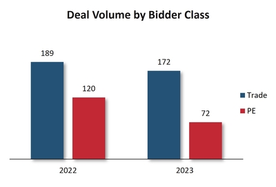 Pharmaceutical giants are actively leveraging M&A, both domestic and cross-border, as a strategic tool to bolster their pipelines, especially as patents for numerous blockbuster drugs are set to expire later this decade. In 2023, deal volumes in the pharma sector remained robust, mirroring the previous year's activity. This underscores the sustained allure of the industry, with PE investors eyeing lucrative returns and trade buyers keen on bridging innovation gaps through strategic acquisitions. However, regulatory scrutiny, evident in the delays of some major deals in 2023, has instilled caution. To navigate this, many are pivoting towards acquiring a plethora of small to medium-sized entities. This is primarily due to higher returns offered on already proven IP which is further along the development path