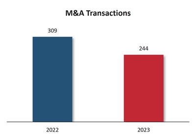 Despite the significant volume of PE dry powder to be deployed there was a noticeable decline in PE deals in 2023. Volumes declined across both primary and secondary deals as processes were put on hold, vendor expectations were difficult to meet, and debt financing was harder to secure. Several funds have delayed exiting portfolio companies due to valuation concerns and there is likely to be an increased volume of PE portfolio companies coming to market in the next 12 months as LPs continue to exert pressure on funds to return capital. Healthcare subsectors that continue to receive significant PE interest include healthcare IT, outsourced pharma services, and outsourced services to the NHS